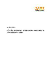 Opinnäytetyön tarkoitus on integroida sähkön spot-hinta rakennusautomaatiojärjestelmään. Tavoitteena on saada API:n (Application Programming Interface) avulla seuraavan vuorokauden hinnat automaatiojärjestelmään ilman erillisiä laitteita. Tarkoitus on myös rakentaa kokonaisuus, joka sisältää integraation toiminnallisuudet, valmiita ohjelmallisia toiminnallisuuksia sekä graafisen käyttöliittymän. Kokonaisuuden tulisi olla sellainen, että se on helppo kopioida uusien kohteiden järjestelmiin ilman kohdekohtaisia muutoksia. Automaatiojärjestelmänä käytetään Schneider Electricin EcoStruxure Building Operation järjestelmää ja data haetaan ENTSO-E:n sivuilta API:n avulla. Rakennetaan script ohjelma, joka hakee datan sekä käsittelee sen niin, että se voidaan esittää grafiikassa. Työn tuloksena spot-hinta on onnistuneesti integroitu järjestelmään, ja se on valmiina hyödynnettäväksi halutuissa käyttötarkoituksissa. Spot-hinnan avulla kiinteistön energiankulutus voidaan optimoida hyödyntämään vuorokauden hetkiä, kun sähkö on halpaa. The purpose of this thesis is to integrate electricity spot prices into the automation system. The goal is to obtain the following day’s prices to the automation server by using API (Application Programming Interface) and without needing any extra equipment or devices. Another goal is to build a widget, which includes the functionality of integration, readymade calculations, and a graphical interface. The widget will be executed so that it’s easy to copy in new project’s automation systems without needing any project specific changes. Automation system that is used is Schneider Electric EcoStruxure Building Operation system. The data has been fetched from ENTSO-E Transparency Platform using their API. During this thesis work a script program was created to fetch and process the data so that it can be shown in the interface. Spot price has been successfully integrated into the automation server and it is ready to be used in any desired use the customer wants. With the help of spot prices, buildings can become more energy efficient by optimizing the usage of electricity to the times of day when electricity is cheap.