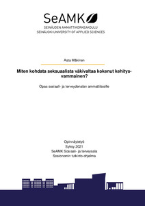 vammaistyön toimintaympäristöjä sekä kehitysvammaisten henkilöiden kanssa työskentelevien ammattilaisten pätevyysvaatimuksia. Teoriaosuudessa syvennytään seksuaalisuuden huomioimiseen asiakastyössä, kehitysvammaisten henkilöiden seksuaalisuuden erityispiirteisiin, seksuaalisen väkivallan muotoihin sekä puheeksi ottamisen ja turvataitokasvatuksen merkitykseen seksuaalisen väkivallan ennaltaehkäisyn menetelminä. Opinnäytetyön tutkimuksellisessa osuudessa on kerätty aineistoa haastattelemalla kehitysvammaisten henkilöiden kanssa eri roolissa toimivia sosiaali- ja terveydenalan ammattilaisia siitä, millainen opas haastateltavien henkilöiden näkemysten mukaan palvelee parhaiten ammattilaisia heidän kohdatessaan kehitysvammaisia seksuaalisen väkivallan epäilyn uhreja. Haastatteluista esiin nousi myös ammattilaisten lisätiedon tarve seksuaalisen väkivallan muodoista sekä puheeksi ottamisen ja turvataitokasvatuksen menetelmistä seksuaalisen väkivallan ennaltaehkäisyssä.