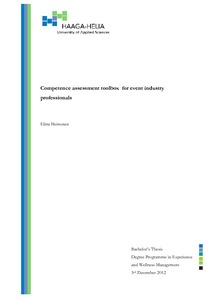 The purpose of this project based thesis is to design an effective competence assess-ment tool for event management industry professionals. The writer noticed the lack of competence tools for the event management industry and therefore wanted to follow the topic trough a project thesis. The competence assessment tools will be designed through a portfolio of competence related instruments.