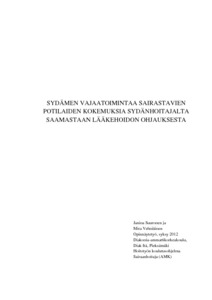 Suuronen, Janina & Vehniäinen, Mira. Sydämen vajaatoimintaa sairastavien potilaiden kokemuksia sydänhoitajalta saamastaan lääkehoidon ohjauksesta. Diak Itä, Pieksämäki, syksy 2012, 43 s., 1 liite.