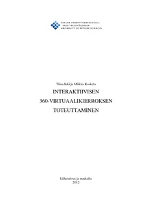 Opinnäytetyössämme selvitimme, miten toteutetaan näyttävä interaktiivinen 360 asteen panoraamaesitys ja esityksistä koostuva virtuaalikierros, mitä työvaiheita prosessi sisältää sekä miten ohjeistetaan aiheesta kiinnostuneita opiskelijoita. Teimme Vaasan ammattikorkeakoulun Tietojenkäsittelyn osaston toimeksiantona projektiopiskelijoille kattavan ohjeistuksen 360-virtuaalikierroksen toteuttamisesta. Sen tarkoitus on opastaa opiskelijoita vaihe vaiheelta prosessin alusta loppuun, perustoteutuksesta hienosäätöihin.