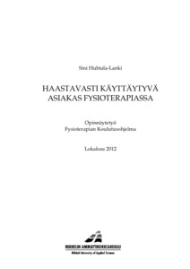 esitellään haastavasta käyttäytymisestä aiheutuvia ongelmia sosiaali- ja terveysalalla. Lisäksi teoriaosuus sisältää työturvallisuuteen sosiaali- ja terveysalalla liittyvää lainsäädäntöä, sekä aiheeseen liittyvää koulutusta. Käytännön työ koostui kvalitatiivisesta tutkimuksesta, jossa kyselylomakkeen avulla selvitettiin Kymenlaakson Fysioterapeutit ry:n jäseniltä heidän kokemuksiaan haastavasti käyttäytyvän asiakkaan kohtaamisesta, sekä koulutustarpeista. Vastausten avulla selvisi, että suurin osa