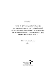 Opinnäytetyön tarkoituksena oli kuvata arviointihoitajamallin toteutumista sairaankuljettajien ja hoitajien välisessä vuorovaikutuksessa potilaan tulotilanteessa Satakunnan keskussairaalan ensihoidon ja päivystyksen toimialueella. Satakunnan keskussairaalan ensihoidon ja päivystyksen toimialueella oli 2011- 2012 käynnissä ”Toimintakykyisenä ikääntyminen” – hankkeen osahanke, jossa kehitettiin yhteispäivystyksessä arviointihoitajamallia. Hankkeen päätyttyä haluttiin tietoa arviointi-hoitajamallin toteutumisesta päivystyksessä.