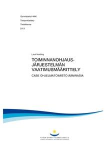 Opinnäytetyön aiheena on toiminnanohjausjärjestelmän vaatimusmäärittelyn luominen Ohjelmatoimisto Äänirasialle. Tarkoituksena on tuottaa dokumentti, jonka avulla voidaan toimittaa palveluntarjoajille realistiset vaatimukset ja näin helpottaa toiminnanohjausjärjestelmän valintaa.