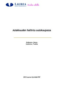 Tässä opinnäytetyössä tavoitteena oli selvittää Gavidae Oy:n toimeksiannosta asiakkuuden hallintaa suomalaisessa autokaupassa. Gavidae teki kesällä 2012 alustavan markkinakartoituksen konsultointituotteelleen autoliikkeille tarjottavasta asiakkuuden hallinnan kehittämisestä. Opinnäytetyössä selvitettiin tarkemmin alan tilaa, sekä kysyntää tälle tuotteelle.