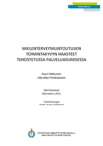 Opinnäytetyön tilaajana oli mielenterveyskuntoutujille palveluasumista tarjoava Jyväskylän Seudun Tukikodit Oy (JST). Opinnäytetyön tavoitteena oli selvittää mielenterveyskuntoutujien toimintakyvyn ongelmia tehostetussa palveluasumisessa henkilökunnan kokemana. Kuntoutujien toimintakyvyn ongelmien näkyväksi tekeminen palvelee opinnäytetyön tilaajatahon tehostetun palveluasumisen kuntoutuspalvelujen tuottamista interventioiden asiakaslähtöisessä suunnittelussa ja kuntou-tuspalveluiden kehittämistyössä.