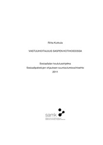 Opinnäytetyössä tutkittiin Sastamalan perusturvakuntayhtymän (Saspen) kotihoidon vastuuhoitajuutta. Tutkimuksessa selvitettiin, mitkä ovat Saspen vastuuhoitajuuden tämänhetkinen tilanne, hyvät ja huonot puolet, sekä tulevaisuutta ajatellen kehittämistä kaipaavat asiat. Tutkimusmenetelmänä teoriatiedon lisäksi käytettiin ryhmähaastattelua. Haastateltavina oli Saspen Vammalan kotihoidon työntekijöitä.