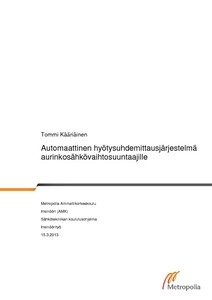 Tässä insinöörityössä selvitettiin kokeellisesti, miten toteuttaa automatisoitu hyötysuhteenmittausjärjestelmä aurinkosähkövaihtosuuntaajien testaukseen. Hyötysuhteiden sekä staattisten ja dynaamisten MPPT-hyötysuhteiden määritykset standardien IEC 61683 ja EN 50530 mukaisesti oli havaittu työn tilanneessa yrityksessä työläiksi, ja automatisoinnilla haluttiin tehostaa laitteiden testausta. Opiskelijaryhmä oli aiemmin työskennellyt järjestelmän toteuttamiseksi, mutta työtä ei ollut saatettu loppuun johtuen ongelmista valitun DC-lähteen tuottaman sähkön laadun suhteen.