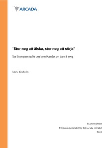 Syftet med examensarbetet är att skapa en förståelse för hur sorg hos barn som förlorat en nära anhörig kan ta sig uttryck samt hur bemötande av barn i sorg där anpassning är målet kan se ut. Studiens frågeställningar är följande: 1. Vilka uttryck kan sorg hos barn ta? 2. Hur kunde bemötandet av barn i sorg se ut? Till den teoretiska referensramen inkluderas följande teorier: Cullbergs teori om den traumatiska krisens faser, Wordens teori om sorgeprocessens uppgifter samt Bowlbys anknytningsteori. Den resterande teoretiska referensramen innehåller två delar där den första delen behandlar sorg hos barn och består av barn förståelse av dödsbegreppets innebörd, ett dödsfalls påverkan hos ett barn, omedelbara kris- och sorgereaktioner, efterreaktioner samt avvikande sorgereaktioner. Den andra delen fokuserar på stöd för barn i sorg och innefattar professionalitet i arbetet med barn i sorg samt bemötande av barn i sorg. Som metod har litteraturstudie valts och analysmetoden är innehållsanalys. Får att få ett resultat har 12 relevanta artiklar inkluderats, bearbetats och analyserats. Resultatet av studien är att ett barns sorge-mönster och reaktioner alltid är individuella och påverkas av faktorer som utvecklingsnivå samt den kognitiva, emotionella och sociala mognadsgraden. Barn upplever en rad olika fysiska, emotionella och kognitiva reaktioner samt beteendesymptom vid en förlust. Ibland kan sorgen utvecklas till komplicerad sorg där individen förblir i ett sorgetillstånd var det ej sker några framsteg mot ett slutförande av sorgeprocessen, vilket kan leda till en psykisk funktionsnedsättning. Stödet till barn i sorg kännetecknas av att det behöver vara så adekvat som möjligt. Essentiellt för ett adekvat stöd och bemötande är framför allt att barns individuella reaktioner och behov bör tas i beaktande. Därigenom behövs kunskaper och färdigheter i barns utveckling och sorgeprocess. Stödet behöver vara tillgängligt och den professionella behöver vara emotionellt närvarande samt sträva till en öppen kommunikation. Denne bör vara beredd att ingripa i ett tidigt skede och hitta lämpliga stödformer samt tillsätta ett specialistingripande vid behov. Stödet behö-ver alltid vara tillräckligt och ges under hela sorgeprocessen. Stödet till barn i sorg bör alltid karaktäriseras av att vara målinriktat med det primära målet att återställa barnets tidigare funktionsnivå samt en strävan till att möjliggöra normalisering och anpassning. Individen kan använda sig av olika copingstrategier för att nå anpassning. The aim of the study is to create an understanding of the expressions of grief in children who have lost a close family member and how to treat bereaved children when coping is the goal. The questions are: 1. How can symptoms of grief be expressed by bereaved children? 2. How can professionals treat bereaved children? The theoretical framework includes following theories: Cullbergs crises theory, Wordens theory of the four tasks of grief and Bowlbys attachment theory. The remaining theoretical framework consists two parts where the first part discusses children’s understanding of death, impact of loss on children, the sudden and the following reactions to crisis and loss and complicated reactions. The other part includes professionalism in working with bereaved children and the treatment of bereaved children. The method is a literature study with content analysis as an analyzing method. 12 relevant articles have been included and analyzed. The result of this study showed that children’s reactions to grief are individual due to the cognitive, emotional and social development. Bereaved children experience a variety of physical, emotional and cognitive reactions and symptoms. The grief can also become complicated which in turn can lead to mental impairment. The support for bereaved children needs to be adequate. Essential for an adequate support is the consideration of children’s individual reactions and needs. Professionals need to receive relevant training in children’s development and bereavement process. The support needs to be accessible and the professional should to be emotionally available. He or she should aim for an open conversation and be prepared for an early intervention. Appropriate support methods should be used and if needed specialists should intervene. I also important that the support is sufficient and provided throughout the whole bereavement process. The support for bereaved children should be characterized as goaldirected with the primary goal to restore earlier function and to facilitate normalizing and coping. The individual can use several coping strategies to reach an adjustment to grief.