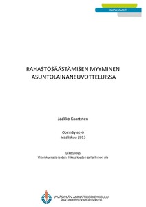 Opinnäytetyön aiheena oli perehtyä rahastosäästämisen myymiseen asuntolainaneuvotteluissa ja saada tietoa neuvotteluiden mahdollisista haasteista sekä selvittää, mitä tukea toimihenkilöt kaipaavat asuntolaina-neuvotteluiden tulokselliseen läpi viemiseen. Myyntiprosessi perustuu ratkaisumyynnin myyntiprosessiin, jossa pyritään saamaan mahdollisimman tarkka tieto asiakkaan tilanteesta ja tarpeista. Näiden tietojen pohjalta pyritään tekemään mahdollisimman järkevä tarjous, joka kattaa asiakkaan koko finanssiasioiden hoidon. Oletetusta kokonaistarjouksesta käsitellään asuntolaina, rahastot ja rahastosäästäminen. Myynnin tuki on olennainen osa myyntiprosessia, ja sen eri osa-alueet esitellään.