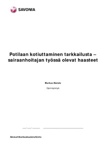 Tässä opinnäytetyössä tutkittiin Ylä-Savon SOTE kuntayhtymän Iisalmen sairaalan yhteispäivystyksen tarkkailun potilaan kotiuttamista. Potilaan kotiuttamisessa esiintyviä ongelmia tarkasteltiin sairaanhoitajan näkökannalta. Haastatteluilla saatiin tietoa mitkä ovat potilaan kotiuttamisessa ongelmakohdat, miten sairaanhoitajan työkokemus vaikuttaa potilaan kotiuttamiseen sekä mitkä tekijät kuormittavat sairaanhoitajan työtä potilaan kotiuttamisen yhteydessä.