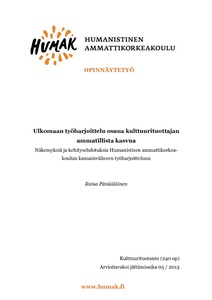 ammattikorkeakoulusta valmistuneiden kulttuurituottajien ammatilliseen kasvuun. Työssä myös etsitään keinoja kehittää ulkomaan työharjoittelua niin, että opiskelija saisi siitä mahdollisimman paljon irti. Aineisto on kerätty sähköpostihaastatteluilla, jotka lähetettiin 20 Humanistisesta ammattikorkeakoulusta valmistuneelle kulttuurituottajalle. Haastattelukysymyksiin vastasi loppujen lopuksi yhdeksän kulttuurituottajaa Humakin eri kampuksilta.