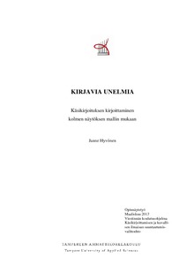 Kirjoitin opinnäytetyökseni kuusikymmentäkuusisivuisen käsikirjoituksen. Elokuvan nimi on ”Kirjavia unelmia” ja se on romantiikalla ja huumorilla höystetty draama. Valitsin tarinan rakenteeksi kolmen näytöksen mallin, koska uskoin sen parhaiten tukevan protagonistin draaman kaarta ja halusin samalla oppia tuosta tärkeästä rakennemallista mahdollisimman paljon. Noin yhdeksänkymmentä prosenttia kaikista elokuvista kirjoitetaan sen mukaan ja sitä pidetään kaupallisesti toimivana rakenteena.