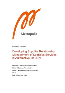 (2025)The thesis examines how supplier relationship management practices can be developed to improve the performance of logistics services in the automotive industry, focusing on the Greek market. The thesis adopts the action ... -