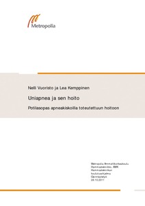 (Metropolia Ammattikorkeakoulu, 2011)Viime vuosina aikuisten uniapnea-diagnoosit ovat voimakkaasti lisääntyneet ja tarve potilaiden informointiin on kasvanut. Arviolta 150 000 suomalaista kärsii obstruktiivisesta uniapneasta. Diagnoosin saanut potilas on ... -