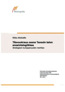 (Metropolia Ammattikorkeakoulu, 2012)Tämä opinnäytetyö on tilaustyö Tanssin talo ry:lle. Tanssin talo ry:n tavoitteena on tanssille soveltuvan, kansainväliset mitat täyttävän tilakokonaisuuden saaminen Suomeen ja näin pyrkiä ratkaisemaan vuosia jatkuneen ... -
