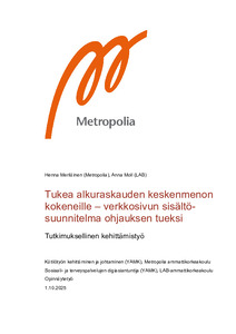 (2025)Opinnäytetyö toteutettiin yhteistyössä nuorten työpajatoiminnan kanssa. Nuorten työpajat on suunnattu NEET-nuorille, eli nuorille, jotka eivät ole työelämässä tai koulutuksessa. Toiminnan tarkoituksena on tukea elämänhallintaa, ... -