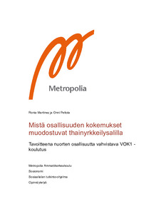 (2025)Tämän tutkimuksellisen opinnäytetyön tarkoitus oli kerätä tietoa siitä, minkälaisista asioista Helsinki Thaiboxing Clubilla muodostuu osallisuuden kokemuksia. Opinnäytetyön kohderyhmänä oli 18–29-vuotiaat Helsinki Thaiboxing ... -