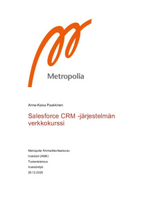 (2025)Tämän insinöörityön aiheena on luoda CRM-järjestelmää koskeva verkkokurssi Metropolian Tuotantotalouden opetuskokonaisuuteen. Tavoitteena on rakentaa kurssirunko sekä tehdä kurssille tarvittavat määritykset, kuten sen ... -