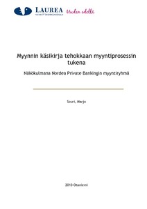 Myynti on yksi yritysten tärkeimmistä toiminnan osa-alueista. Yrityksen keskeisimmät tavoitteet ovat tehdä voittoa ja hankkia lisää asiakkaita. Myyntiprosessin tulisi olla tehokas, jotta asetetut tavoitteet voidaan saavuttaa. Toimintaympäristön muutos ja kilpailutilanteen kasvaminen ovat osa yritysten jokapäiväisiä haasteita. Henkilöstön on oltava valmiita kehittymään ammatillisesti ja uudistamaan toimintamallejaan. Tämä tutkimus on tehty toimeksiantona Nordea Pankki Suomi Oyj:n Private Banking Helsingin yksikölle, tarkemmin ottaen yksikön myyntiryhmälle. Tutkimukseen on osallistunut kohdeorganisaation kaikki kahdeksan myyntiryhmän jäsentä. Tarkoituksena on selvittää kohdeorganisaation myyntiprosessi ja sen kehittämistarpeet. Tavoitteena on luoda myynnin käsikirja kohdeorganisaation käyttöön. Käsikirja luo kohdeorganisaatiolle edellytykset toteuttaa myynnin prosessia tehokkaammin.