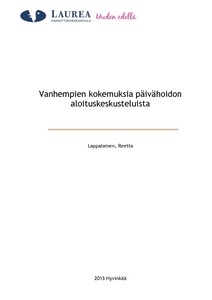 Keravalla otettiin käyttöön Varhaiskasvatuksen aloitusprosessi vuonna 2010. Tämän opinnäytetyön tarkoituksena oli saada vanhempien ääni kuuluville ja tavoitteena selvittää, miten vanhemmat ovat kokeneet varhaiskasvatuksen aloitusprosessiin kuuluvan aloituskeskustelun. Aloituskeskustelu käydään, kun lapsi on saanut päivähoitopaikan. Aloituskeskustelussa ovat läsnä päivähoidon kasvattajat ja lapsen vanhemmat. Aloituskeskustelussa keskitytään kuulemaan vanhempia ja käsitellään sekä lapsen asioita että vanhempien omia odotuksia, tuntemuksia ja kokemuksia.