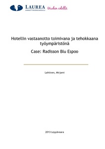 Tämän opinnäytetyön toimeksiantajana toimi Otaniemessä sijaitseva Radisson Blu Espoo. Radisson Blu Espoo hotellissa on 209 huonetta ja suurin osa sen asiakkaista on business-matkailijoita, sen sijaitessa lähellä Keilarannan yrityskeskittymää. Radisson Blu kuuluu kansainväliseen Rezidor Hotel Group konserniin. Opinnäytetyön tarkoituksena oli selvittää erilaisia keinoja, joiden avulla hotellin vastaanotosta voidaan luoda toimivampi sekä kustannustehokkaampi. Toimivassa vastaanotossa työntekijät ovat motivoituneita, tehokkaita sekä asiantuntevia. Kustannukset pysyvät hallittuina, kun henkilöstöjohtaminen on toimivaa. Opinnäytetyön tavoitteena oli antaa yritykselle kehitysehdotuksia sekä tuoda esille mahdollisia epäkohtia vastaanoton toiminnassa.