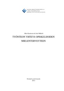 Tutkimuksen tarkoituksena oli selvittää ammattikorkeakoulun terveysalan opiskelijoiden työntekoa ja sen yhteyttä heidän mielenterveyteensä. Tutkimus oli kvantitatiivinen ja tutkimusaineisto kerättiin keväällä 2013 erään ammattikorkeakoulun terveysalan opiskelijoilta strukturoidun kyselylomakkeen avulla. Tutkimus rajattiin koskemaan nuorisoasteen opiskelijoita. Tulokset analysoitiin SPSS-tilasto-ohjelman avulla. Kyselyyn osallistui 97 opiskelijaa, joista naisia oli 89 ja miehiä kahdeksan, iältään vastaajista suurin osa oli alle 25-vuotiaita.