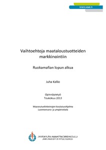 Yhtenä syynä maatalouden huonolle kannattavuudelle näen tämän neuvotteluvoiman puuttumisen alkutuottajilta. Opinnäytetyössä on kuvattu vaihtoehtoisia tapoja, joilla viljelijä voisi markkinoida tuotteitaan: ei siis ruokamafian kautta vaan siten, että viljelijälle itselleen jäisi parempi kate työstään. Opinnäytetyö on kvalitatiivista tutkimusta, joka pohjautuu kirjallisuusanalyysiin, lehti- ja internet-artikkeleihin.
