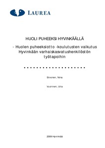 Tämän opinnäytetyön tavoitteena oli selvittää Huolen puheeksiotto –koulutusten (Hupu) vaikutusta Hyvinkään varhaiskasvatushenkilöstön työtapoihin. Työssä tarkasteltiin varhaisen puuttumisen menetelmiä, joita ovat huolen puheeksiotto, varhainen tukeminen, kasvatuskumppanuus ja verkostoyhteistyö. Opinnäytetyöhön liittyvä tutkimus käsitti määrällisen lomakekyselyn ja laadullisen haastattelututkimuksen.