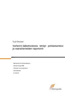 Opinnäytetyön tarkoituksena oli selvittää varfariini-lääkehoidon vakavista vaaratilanteista tehdyt potilaskantelut pääkaupunkiseudulla. Työn tavoitteena oli antaa tietoa varfariini-lääkehoidon potilasturvallisuudesta ja tuoda esille kehittämisehdotuksia haittatapahtumien raportoimiseen. Teoreettinen viitekehys koottiin kartoittamalla tutkimustietoa varfariini-lääkehoidon yleispiirteistä, riskitekijöistä ja vaaratilanteista. Lisäksi viitekehykseen kerättiin ajankohtaista tietoa ja suosituksia kansallisesta potilasturvallisuus- ja raportointijärjestelmästä. Työelämäyhteistyö toteutui Etelä-Suomen aluehallintovirastossa käymällä läpi vuosina 1998−2011 ratkaistut potilaskantelut. Aineiston läpikäymiseen ja analysointia varten käytettiin havainnointia ja sisällön erittelyä eli sekä laadullista että määrällistä menetelmää.