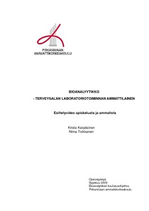 Opinnäytetyön tavoitteena on jakaa esittelyvideon avulla tietoa bioanalyytikon työstä ja koulutuksesta koulutusohjelmaan opiskelemaan pyrkiville. DVD- muotoon tallennettu esittelyvideo sisältää informaatiota bioanalytiikan opinnoista, ammatista sekä jatkokoulutusmahdollisuuksista. Opinnäytetyöprosessin tuloksena syntyi kahdeksan minuutin pituinen esittelyvideo nimeltään Bioanalyytikko – terveysalan laboratoriotoiminnan ammattilainen. Valmis DVD- tallenne on luovutettu Pirkanmaan ammattikorkeakoulun opettajien käyttöön ja on vapaasti käytettävissä silloin, kun lyhyen mutta kattavan ammattiesittelyn katsotaan olevan paikallaan. Lisäksi tallenne on annettu Pirkanmaan ammattikorkeakoulun opintojen ohjaajalle sekä Pirkanmaan sairaanhoitopiirin Laboratoriokeskukselle.