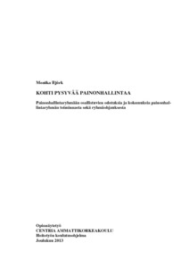 Opinnäytetyön tarkoituksena oli kuvata liikelaitos Työplussan painonhallintaryhmään osallistuvien kokemuksia ryhmäohjauksesta sekä selvittää, millaisia odotuksia ja tavoitteita painonhallintaryhmään osallistuvilla on. Tutkimuksessa käytettiin kvalitatiivista eli laadullista tutkimusmenetelmää. Aineisto kerättiin kahdella avoimella kyselylomakkeella, jotka sisälsivät yhteensä yhdeksän avointa kysymystä. Ensimmäinen kyselylomake jaettiin syksyllä 2012 ja toinen keväällä 2013 11 painonhallintaryhmään osallistuvalle. Kyselylomakkeita palautettiin 7 molempiin kyselyihin. Tutkimusaineisto analysoitiin sisällönanalyysin avulla.