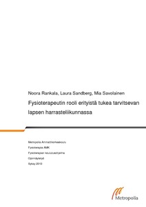 Opinnäytetyö toteutettiin yhteistyössä Suomen Vammaisurheilu ja -liikunta VAU ry:n kanssa. Työmme tarkoituksena oli selvittää haastattelujen avulla näkemyksiä fysioterapeutin roolista liittyen ala-asteikäisten, erityistä tukea tarvitsevien lasten harrasteliikuntaan. Työmme kohderyhmänä oli erityistä tukea tarvitsevien lasten liikuntakerho pääkaupunkiseudulla. Työhömme valikoitui kolme eri näkökulmaa. Valitut näkökulmat kattavat mietteitä lapsen, fysioterapeutin ja vanhempien perspektiivistä. Työssämme harrasteliikunta käsittää vapaa-ajalla tapahtuvaa ohjattua liikuntaa. Toteutimme haastattelut yksilöhaastatteluina. Haastatteluissa käytimme puolistrukturoitua haastattelurunkoa ja kysymykset jaettiin teemoittain isompien otsikoiden alle. Haastattelut nauhoitettiin, litteroitiin ja analysoitiin tarkasti. Teemoina haastatteluissa olivat harrasteliikunnan merkitys erityistä tukea tarvitsevan lapsen elämään, fysioterapeutin rooli harrasteliikunnassa sekä tulevaisuuden näkymät. Haastattelujen perusteella harrasteliikunnan tärkeimmiksi seikoiksi nousivat sosiaaliset suhteet, uusien taitojen oppiminen sekä liikunnan tuomat fyysiset hyödyt. Fysioterapeutin rooli ja ohjausosaaminen koettiin merkittävänä lapsen liikuntaan osallistamisen kannalta. Fysioterapeuttinen ohjausosaaminen piti sisällään muun muassa ohjaamista harrasteliikunnan pariin, liikunnassa rinnakkaisten toimintojen kehittämistä lapsen erityistarpeiden mukaan ja oikeiden liikemallien tukemista harrasteliikunnassa. Tulevaisuuden kannalta haastateltavat toivoivat lisää matalan kynnyksen toimintaa ja lajikokeiluja.