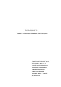 Kivelä, Aino ja Marjamäki, Tarmo. Elvis ja Gospel. Konsertti Yhteisvastuukeräyksen toteuttamistapana. Syksy 2013, 38s., 13 liitettä. Diakonia-ammattikorkeakoulu, Sosiaalialan koulutusohjelma, Diakonisen sosiaalityön suuntautumisvaihtoehto, sosionomi (AMK) + diakonin virkakelpoisuus.