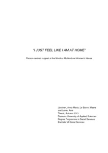 Järvinen, Anna-Maria; Le Baron, Maare and Lehto, Anni. “I just feel like I am at home”: Person-centred support at the Monika- Multicultural Women’s House. 78 pages. 1 appendix. Language: English. Autumn 2013. Diaconia University of Applied Sciences. Degree Programme in Social Services. Degree: Bachelor of Social Services.