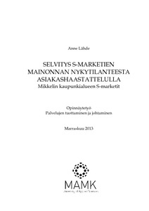 Opinnäytetyön aiheena on selvitys S-marketien mainonnan nykytilanteesta. Työ toteutettiin asiakashaastatteluilla Mikkelin kaupunkialueen S-market-myymälöissä. S-marketit ovat S-ryhmän suurin päivittäistavaraketju, joiden verkosto kattaa koko maan. S-ryhmä on suomalainen vähittäiskaupan ja palvelualan yritysverkosto. Sen muodostavat osuuskaupat ja Suomen Osuuskauppojen Keskuskunta (SOK) tytäryhtiöineen. Mikkelin S-marketit kuuluvat Osuuskauppa Suur-Savoon.