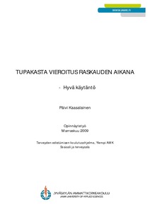 Opinnäytetyön tehtävänä on kerätä tietoa käytössä olevista menetelmistä raskaana olevien naisten tupakoinnin vieroituksessa ja menetelmien vaikuttavuudesta kirjallisuuskatsauksen avulla. Tutkimustiedot kootaan, analysoidaan ja niistä tehdään johtopäätökset. Opinnäytetyön tarkoituksena on löytää hyvä käytäntö (best practice) raskaana olevien naisten tupakasta vieroitukseen. Kirjallisuuskatsauksen perusteella hyväksi havaitut käytännöt tiivistetään selkeään ja nopeasti luettavaan muotoon käytännön työntekijöiden avuksi.