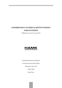 Tämä opinnäytetyö tehtiin UPM Kymmene Oyj:n Tervasaaren paperikone viidelle. Opinnäytetyön tarkoituksena oli selvittää keinoja PK5:n materiaalihyötysuhteen parantamiseksi. PK5:n konelinjan hylkyprosentti oli noussut vuosien 2008–2012 aikana 9,31:sta 10,85:een. Opinnäytetyön tavoitteeksi asetettiin hylyn määrän vähentäminen yhdellä prosentilla.