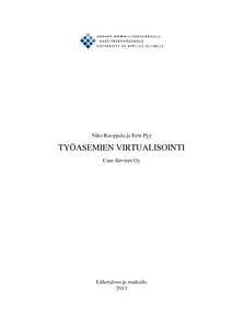 Opinnäytetyön tutkimuksen aiheena on työasemien virtualisointi. Työn tarkoituksena on esittää työasemien virtualisoinnin suorittamiseen eri vaihtoehtoja, joita työn toimeksiantaja pystyy hyödyntämään omassa toiminnassaan. Virtualisointi on nykypäivänä merkittävä haaste, mutta samalla myös mahdollisuus monelle yritykselle ja organisaatiolle. Se on merkittävä osa yritysten tulevaisuuden suunnittelussa.