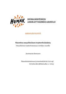 Työssä aihetta lähestytään avaamalla kulttuurisen nuorisotyön käsitettä sekä tuomalla esiin nuorten taiteen tekemiseen liittyviä viimeaikaisia tutkimuksia. Teatteriharrastuksen lainalaisuudet sekä teatteri oppimisprosessina luovat teoreettisen viitekehyksen nuorten omaehtoisen teatteritoiminnan tarkastelulle.