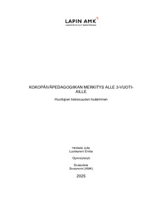 (2025)Opinnäytetyömme tutkimuskysymyksenä oli, miten huoltajien tietoisuutta kokopäiväpedagogiikan merkityksestä voidaan lisätä. Työmme keskittyi tarkastelemaan aihetta alle kolmevuotiaiden varhaiskasvatusryhmässä. Tarkoituksena ... -