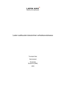 (2025)Opinnäytetyön aiheena on lasten osallisuuden toteutuminen varhaiskasvatuksessa. Opinnäytetyön tarkoituksena oli saada tietoa lasten osallisuuden toteutumisesta, ja tämän takia tein kyselyn varhaiskasvatuksen ammattilaisille, ... -