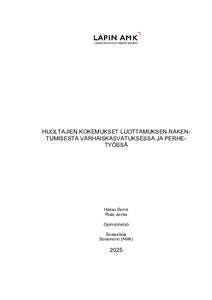 (2025)Opinnäytetyön tarkoituksena oli selvittää, mikä vaikuttaa huoltajien luottamussuhteen syntymiseen ja heikentymiseen varhaiskasvatuksessa sekä sosiaalihuoltolain mukaisessa perhetyössä. Opinnäytetyön osana toteutettiin ... -