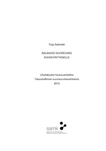 Tämän opinnäytetyön aiheena oli Balanced scorecard kohdeyritykselle. Työssä selvi-tettiin kohdeyrityksen liiketoiminnan kehityksen kohteita, rakennettiin toimiva ja käypä mittaristo sekä asetettiin strategiselle johtamiselle hyvät lähtökohdat. Tasapai-notettu mittaristo rakennettiin, koska kohdeyritys ei ollut ennen käyttänyt mittaristoja liiketoimintansa kehittämiseen. Rakennetun mittariston perusteella haluttiin luoda kohdeyritykselle usko sitoutua mittariston tuomiin hyötyihin.