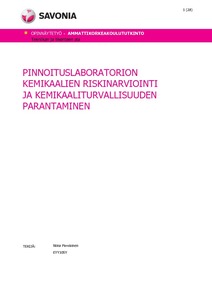 Tämän insinöörityön aiheena oli laatia pinnoituslaboratorion kemikaalien riskinarviointi ja suunnitella toimia kemikaaliturvallisuuden parantamiseksi. Työ tehtiin Savonia-ammattikorkeakoulun pinnoituslaboratoriolle, jossa kehitetään, analysoidaan ja testataan metallikappaleiden nikkeli-, kromi- ja erikoispinnoitteita. Pinnoituslaboratorion toiminta on tutkimus- ja hanketoimintaa. Laboratorio tarjoaa yrityksille pinnoitustestauksia, pinnoitteen laadun tutkimuksia, kovuusmittauksia ja korroosiotestauksia. Työssä oli kolme osiota; lainsäädännön tarkastelu siltä osin kuin se koskee pinnoituslaboratorion toimintaa, pinnoituslaboratorion kemikaalien riskinarvioinnin laadinta sekä konkreettisten parannusehdotusten listaus kemikaaliturvallisuuden parantamiselle pinnoituslaboratoriossa. Näiden lisäksi koottiin turvallisuustaulu, jossa on nähtävillä kaikki olennainen käytössä oleviin kemikaaleihin ja kemikaaliturvallisuuteen liittyvä tieto.