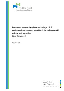 This research-oriented bachelor’s thesis goal is to provide insightful information for Case Company X regarding digital marketing, specifically in terms of in-housing and outsourcing. The objective is to give Case Company X pros and cons of the orientation of digital market-ing internally and externally.