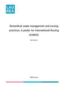 This is a practice-based type of bachelor thesis, including a report and a tangible end-product. Specifically, this thesis creates an educational poster regarding to biomedical waste management based on national rules and guidelines. The target group is international nursing students at Laurea University of Applied Sciences.