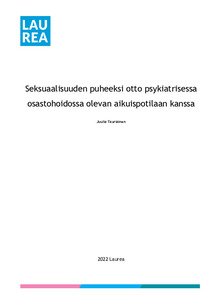 Seksuaaliterveyden ongelmat mielenterveyden häiriöiden yhteydessä ovat tavallisia. Tämän opinnäytetyön tarkoituksena oli tuottaa tietoa, jolla voidaan edistää hoitohenkilökunnan valmiuksia puheeksi ottaa seksuaalisuus potilaan kanssa psykiatrian osastohoidossa. Tämän opinnäytetyön tavoitteena oli tuottaa kirjallisuuskatsauksen avulla tietoa, joka lisää hoitohenkilökunnan ymmärrystä siitä, mitä asioita tulee ottaa huomioon seksuaalisuutta puheeksi ottaessa psykiatrisessa hoidossa olevan potilaan kanssa. Tutkimuskysymys oli mitä tulee ottaa huomioon hoitohenkilökuntana, kun otetaan seksuaalisuuteen liittyviä kysymyksiä puheeksi psykiatrisessa hoidossa olevan potilaan kanssa?