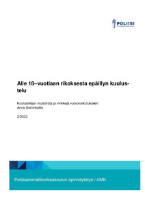 Tämän toiminnallisen opinnäytetyön tavoitteena on selkeyttää alle 18-vuotiaiden rikoksesta epäiltyjen kuulusteluprosessia. Työn tuotoksena syntyy esite, jossa kuvataan sitä, mitä kaikkea kuulustelijan tulee muistaa alaikäistä rikoksesta epäiltyä kuullessaan. Esitteen toisella puolella on vinkkejä nuoren kanssa käytävän vuorovaikutuksen parantamiseen. Esite on ensisijaisesti suunnattu nuorten kuulusteluja tekemään aloitteleville poliiseille, mutta se toimii hyvänä muistinvirkistyksenä, myös jo pidemmän työuran omaaville poliiseille.