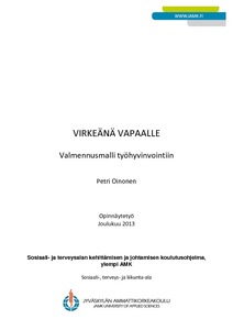 Opinnäytetyö on luonteeltaan laadullinen. Tutkimustyyppinä on tapaustutkimus. Kymmenellä val-mennuskerralla kerätään aineistoa haastattelemalla ja havainnoimalla kahta valmennettavaa sekä tekemällä itsereflektiota. Luonnollisessa ympäristössä kerätyn aineiston avulla lisätään ymmärrystä valmennusmallin laadusta, ominaisuuksista ja merkityksistä. Opinnäytetyön teoriaosuudessa tarkas-tellaan työntekijöiden työkykyyn liittyviä tekijöitä yksilön ja työyhteisön näkökulmasta, sekä toimin-taympäristön ja työhyvinvointityön vaikutusta työhyvinvointiin. Lisäksi käydään läpi esimiestyösken-telyä, siihen liittyviä tekijöitä ja sen vaikutuksia työhyvinvointiin, sekä erilaisia keinoja tukea esimies-työskentelyä. Opinnäytetyön lähtökohtana olleen Virkeänä vapaalle – työhyvinvointi valmennusmallin historia ja toimintaperiaate käydään niin ikään läpi.